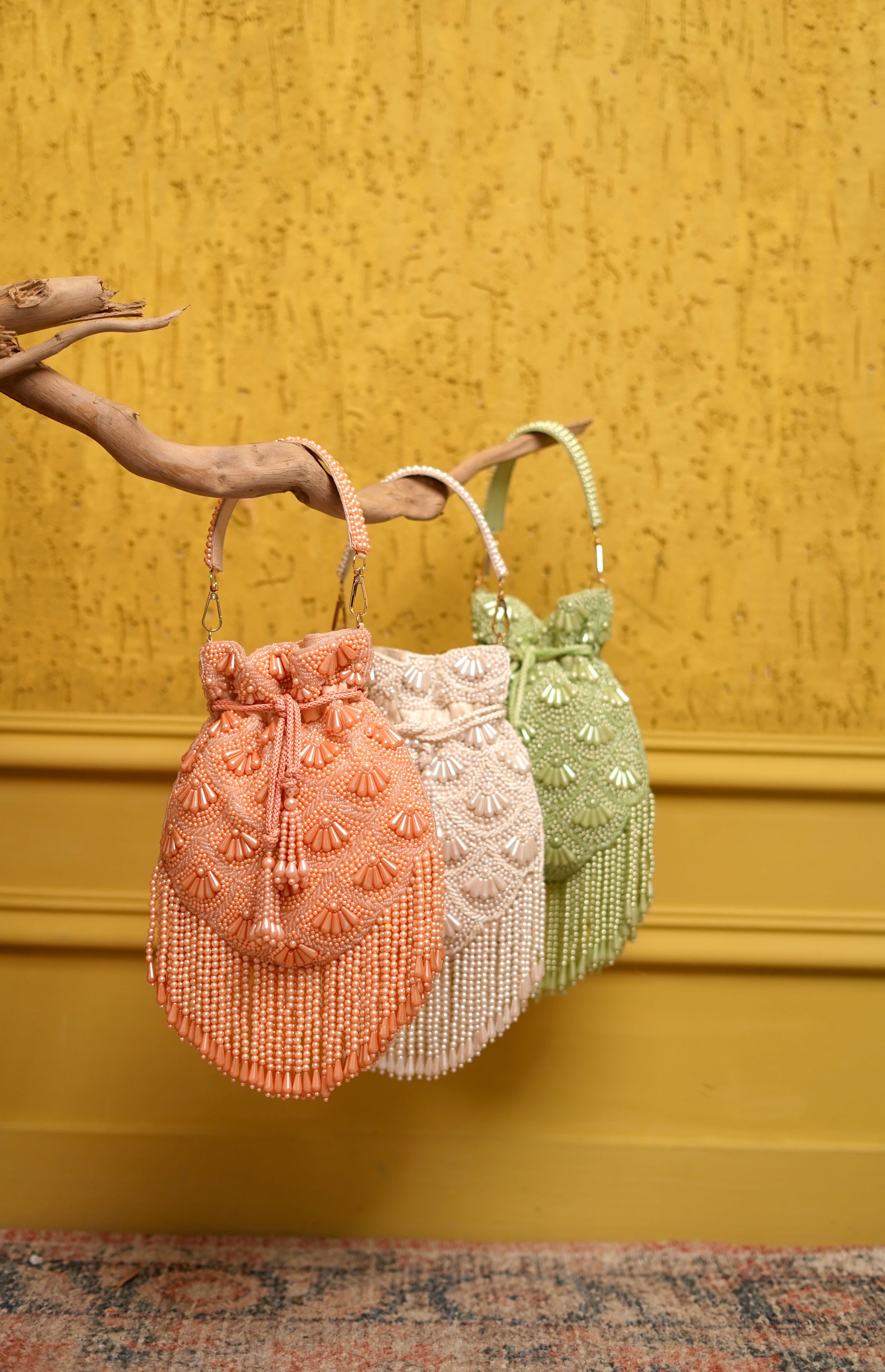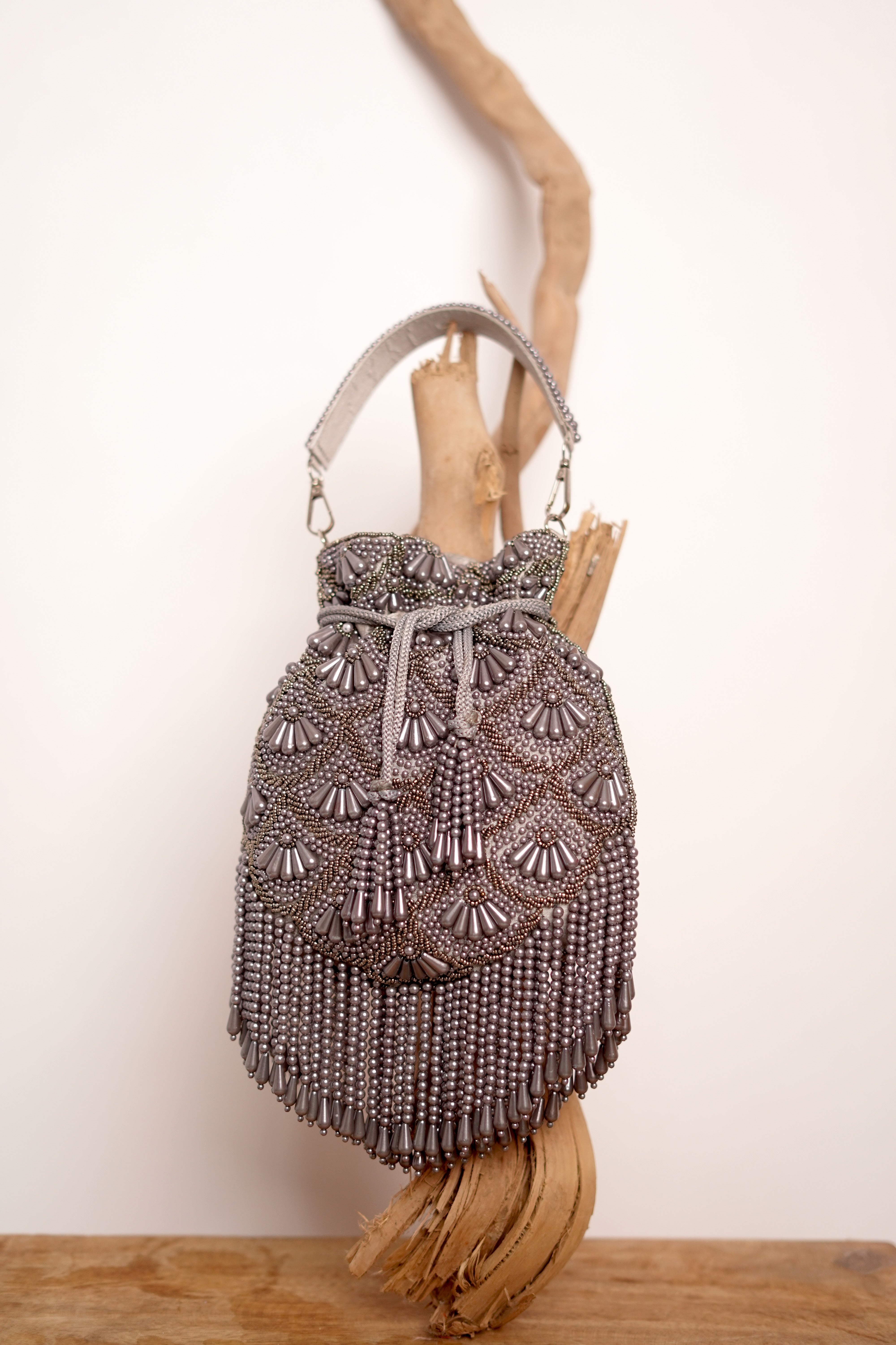Handcrafted pearl embellished silver potli with detachable strap, perfect for weddings and parties.