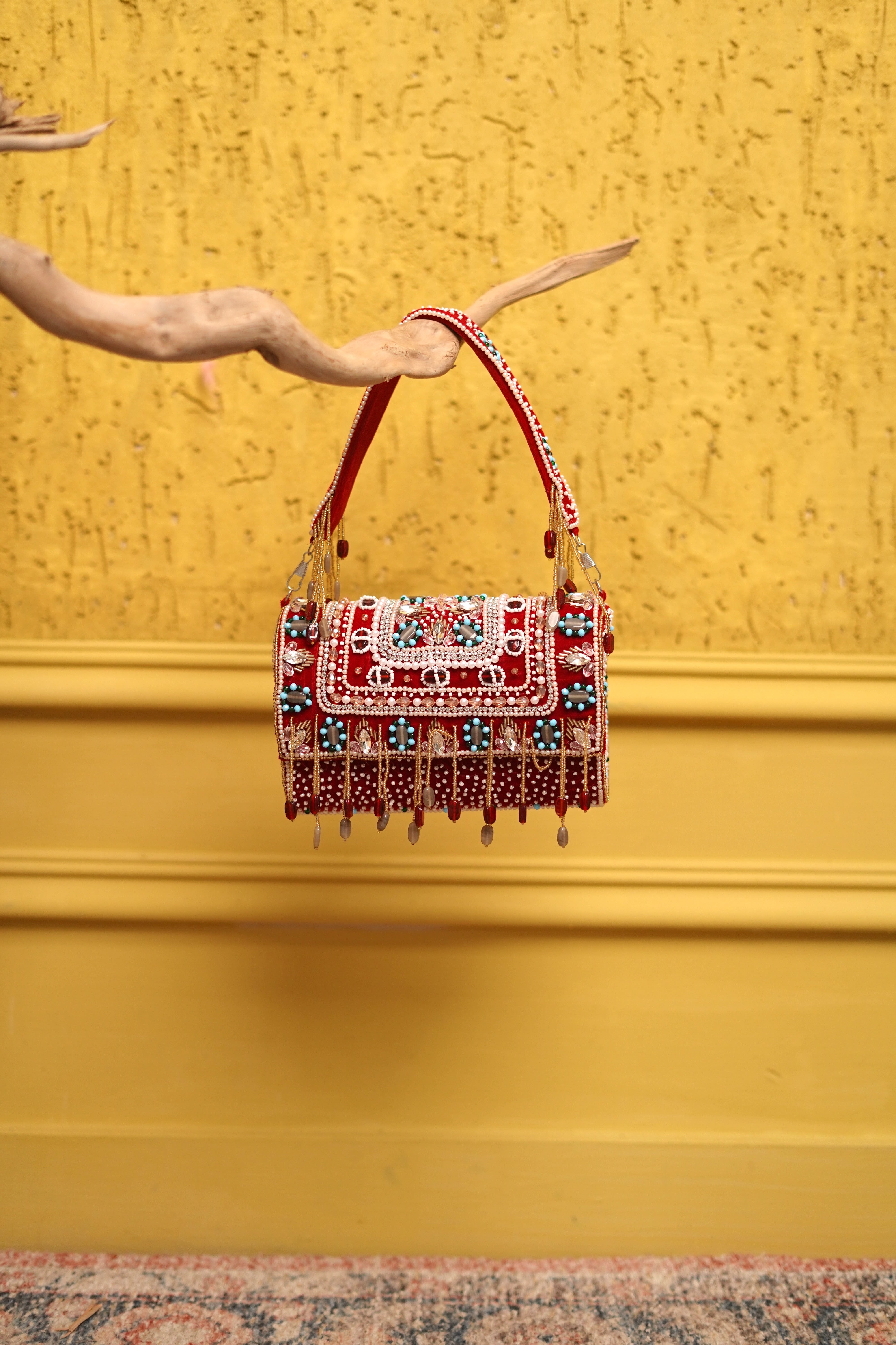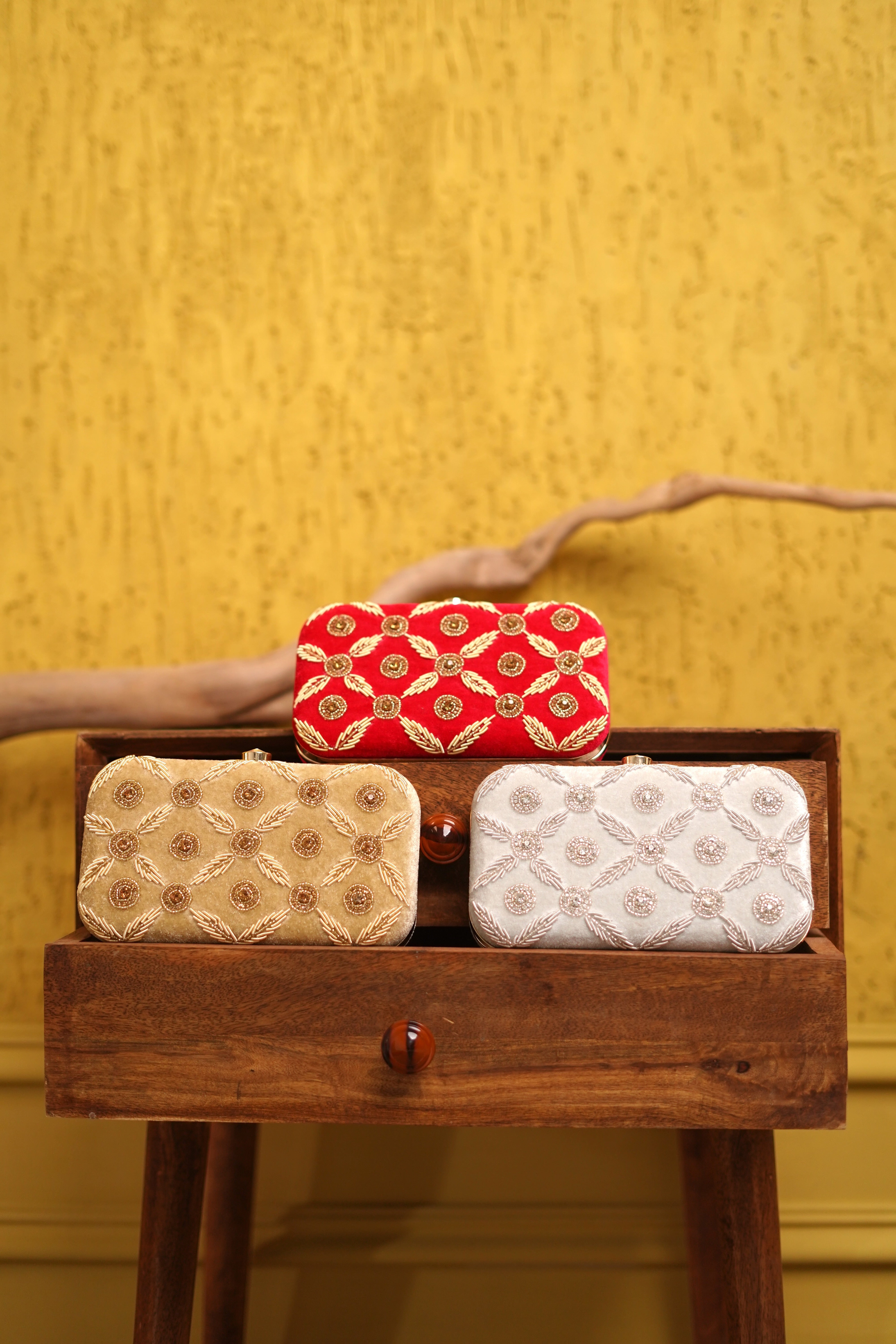 Handcrafted velvet clutch with golden threadwork, perfect for weddings and celebrations.
