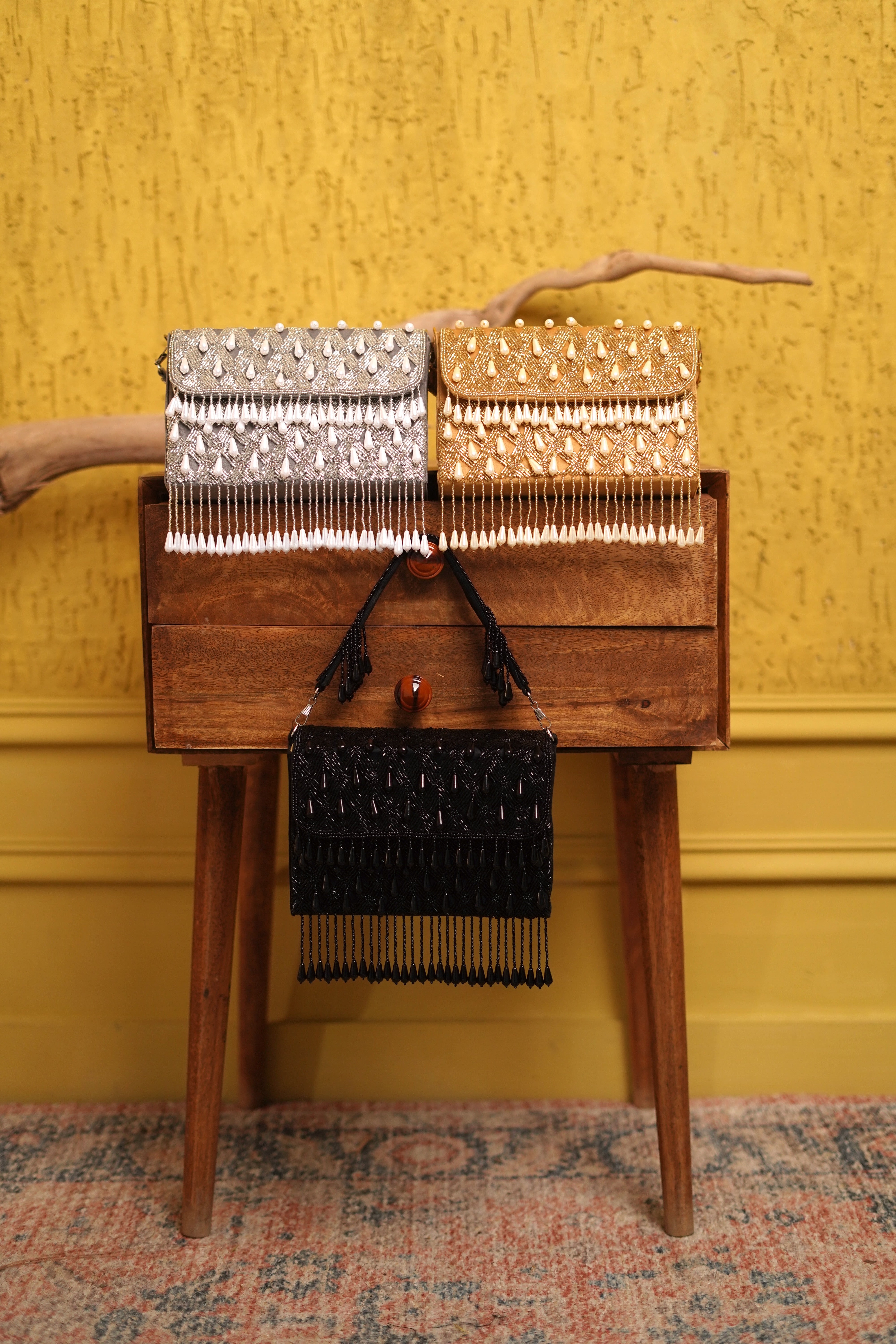 Handcrafted clutch with intricate pearl embroidery and a sleek modern silhouette, finished with cascading pearl tassels, perfect for contemporary and festive occasions.
