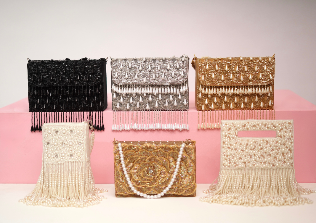 Handcrafted pearl and stone embellished silk clutch with detachable strap, perfect for weddings and parties.